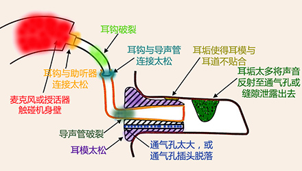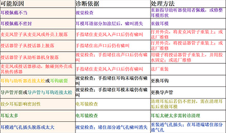<span style="font-size:16px;"> 嘯叫,一直是引起助聽器使用者不滿的一大原因,也是驗配師在助聽器調(diào)試時最為棘手的難題之一。</span></p><p><span style="font-size:16px;"> 通常,嘯叫分內(nèi)部嘯叫和外部嘯叫。內(nèi)部嘯叫常由內(nèi)部零件故障引起,而外部嘯叫則是與助聽器外殼或耳模,助聽器調(diào)試等有關(guān)。</span></p><p style="text-align: center;"><span style="font-size:16px;"><img src="/upfiles/201810100140556872.jpg" alt="" /><br /></span></p><p><span style="font-size:16px;"> 我們常常說的外部嘯叫是在聲音被麥克風(fēng)拾取、放大器放大、授話器轉(zhuǎn)換后,又從各種縫隙(如外殼與耳道的縫隙、通氣孔)中“跑”出來,又“跑”進去,如此反復(fù)多次,使得聲音越來越大,產(chǎn)生“吱吱吱”的惱人嘯叫。</span></p><p><span style="font-size:16px;"> 以助聽器的角度來看,shou話器把聲音授給耳朵聽,當(dāng)用“授”,即授話器。</span></p><p><span style="font-size:16px;"> 接下來將分別針對定制式(ITE/ITC/CIC)和耳背式(BTE)助聽器的嘯叫問題,跟著產(chǎn)生嘯叫的路徑,一一“攻破”嘯叫難題。注意,這里不說助聽器調(diào)試,只尋嘯叫路徑,并“堵死”嘯叫“通路”,讓進入助聽器的聲音“不走回頭路”。</span></p><p><span style="font-size:16px;"> 1、ITE/ITC/CIC助聽器</span></p><p><span style="font-size:16px;"> 先來看看ITE/ITC/CIC助聽器可能發(fā)生嘯叫的路徑。</span></p><p><span style="font-size:16px;"> 圖1里是一個定制式助聽器佩戴于外耳道內(nèi)的示意圖,各種顏色的字和相應(yīng)顏色的標(biāo)記展示了發(fā)生嘯叫的各種情況。</span></p><center><span style="font-size:16px;"><img alt="" src="/upfiles/201810100142273990.png" width="440" height="250" /></span></center><p></p><p style="text-align: center;"><span style="font-size:16px;">圖1:ITE/ITC/CIC助聽器發(fā)生嘯叫的路徑一覽</span></p><p style="text-align: left;"><span style="font-size:16px;"> 例如,紅色表示“麥克風(fēng)管子脫落”,這屬于助聽器內(nèi)部零件脫落、故障,為內(nèi)部嘯叫。</span></p><p><span style="font-size:16px;"> 橙色表示“外殼佩戴太松”,這屬于外殼不密封的聲音泄露,為外部嘯叫。</span></p><p><span style="font-size:16px;"> 那如何檢查出是這些原因,并對問題進行相應(yīng)處理呢?請對照表1中的“診斷依據(jù)”和“處理方法”查看。</span></p><center><span style="font-size:16px;"><img alt="" src="/upfiles/201810100142337254.png" width="520" height="250" /></span></center><p></p><p style="text-align: center;"><span style="font-size:16px;">表1:ITE/ITC/CIC助聽器產(chǎn)生嘯叫的可能原因及對應(yīng)的診斷依據(jù)、處理方法</span></p><p><span style="font-size:16px;"> 例如,當(dāng)發(fā)現(xiàn)“手指堵住麥克風(fēng)入聲口后仍有嘯叫”,可推斷原因是“麥克風(fēng)管子從麥克風(fēng)或外殼上脫落”或“麥克風(fēng)或授話器移動,觸碰到外殼或其他傳感器”,這時的處理方法是“送廠維修”。</span></p><p><span style="font-size:16px;"> 2、BTE助聽器</span></p><p><span style="font-size:16px;"> 學(xué)會了看ITE/ITC/CIC助聽器的一圖一表,再來看看BTE助聽器的嘯叫路徑圖(圖2),以及表2中羅列的可能原因、診斷依據(jù)和處理方法,相信看起來更加輕松、直觀、一目了然。</span></p><center><span style="font-size:16px;"><img alt="" src="/upfiles/201810100142383483.png" width="440" height="250" /></span></center><p></p><p style="text-align: center;"><span style="font-size:16px;">圖2:BTE助聽器發(fā)生嘯叫的路徑一覽</span></p><center><span style="font-size:16px;"><img alt="" src="/upfiles/201810100142449945.png" width="462" height="273" /></span></center><p></p><p style="text-align: center;"><span style="font-size:16px;">表2:BTE助聽器產(chǎn)生嘯叫的可能原因及對應(yīng)的診斷依據(jù)、處理方法</span></p><p><span style="font-size:16px;"> 更多詳情請登錄www.fujibankin.com。</span></p>" />