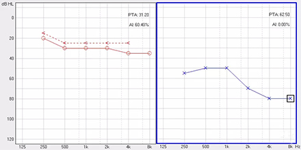 <span style="font-size:16px;"> 純音聽閾測試是聽力學所有測試項目中最基本的一項內容,包括氣導(AC)、骨導(BC)、最舒適閾(MCL)與不舒適閾(UCL)測試。測試結果能夠直接反映患者雙耳的聽力損失程度、性質與動態范圍,還能夠間接反映患者的患病位置、病因與助聽后效果。</span></p><p><span style="font-size:16px;"> 一般地,整個檢查控制在10分鐘左右,既能全面做完檢查,又不至患者疲憊而影響主觀反應。</span></p><p><span style="font-size:16px;"> 純音聽閾測試是最考驗聽力學工作者實際工作能力的一項基本內容:</span></p><p><span style="font-size:16px;"> 1、若患者曾長期暴露于噪聲中,且無其它致聾因素,很可能在3 kHz或6 kHz出現明顯的下降,聽力曲線呈現“V”字形,所以除了常規的倍頻程頻率外,還要加測這兩個頻率,否則就犧牲了多通道助聽器的意義;</span></p><p><span style="font-size:16px;"> 除了有過噪聲接觸史的患者需要加測半倍頻程外,涉及聲場助聽聽閾評估、賠償等情況都需要加測半倍頻程。</span></p><p><span style="font-size:16px;"> 耳鳴困擾的患者,注意避免與耳鳴聲類似的純音,若還用純音作為刺激聲,患者就會分辨不清,出現假陽性或假陰性。所以,測試者要換成囀音,既有別于耳鳴聲,又具有頻率特異性。</span></p><p><span style="font-size:16px;"> 2、不舒適閾反映患者對大聲的忍耐力,不舒適閾與氣導的差值能顯示患者的動態范圍,指導驗配師調節助聽器的最大輸出。</span></p><p><span style="font-size:16px;"> 不舒適閾測試頻率是否越多越好呢?非也。測得頻率過多,一會引起患者疲勞或不適,二是沒必要,大多數助聽器的最大輸出是一個整體,不能像調增益和壓縮那樣分通道,所以測多了并無好處,一般測0.5、1、2、4 kHz。</span></p><p><span style="font-size:16px;"> 3、如果兩側聽力有明顯差異,此時就要準備好掩蔽了,分為氣導掩蔽與骨導掩蔽。</span></p><p><span style="font-size:16px;"> (1)氣導掩蔽的判斷有兩個原則,只要符合其中一個原則,就需要重新測差耳氣導。具體做法是:</span></p><p><span style="font-size:16px;"> 測試完雙耳氣導,若發現某一頻率差耳氣導閾值比好耳氣導閾值多40 dB以上就要懷疑有可能是好耳偷聽的,需要給好耳氣導加掩蔽聲;</span></p><p><span style="font-size:16px;"> 測試完雙耳氣導與好耳骨導,若發現某一頻率差耳氣導閾值比好耳骨導閾值多40 dB以上就要懷疑有可能是好耳偷聽的,需要給好耳氣導加掩蔽聲。</span></p><p><span style="font-size:16px;"> 下面為未掩蔽的聽力圖:</span></p><center><span style="font-size:16px;"><img alt="" src="/upfiles/201810160133207570.png" width="440" height="220" /></span></center><p></p><p><span style="font-size:16px;"> 下圖為掩蔽后的左耳真實氣導值:</span></p><center><span style="font-size:16px;"><img alt="" src="/upfiles/201810160133289538.png" width="440" height="220" /></span></center><p></p><p><span style="font-size:16px;"> (2)骨導掩蔽的判斷原則:</span></p><p><span style="font-size:16px;"> 測試完雙耳氣導與好耳骨導,若發現某一頻率差耳氣導閾值比好耳骨導閾值大于等于15 dB就必須予以掩蔽,重測骨導。下圖為右耳氣導加掩蔽后左耳骨導的真實值:</span></p><center><span style="font-size:16px;"><img alt="" src="/upfiles/201810160133368026.png" width="440" height="220" /></span></center><p></p><p><span style="font-size:16px;"> 注意:</span></p><p><span style="font-size:16px;"> 1)掩蔽的規則要按順序適用;</span></p><p><span style="font-size:16px;"> 2)各頻率根據規則決定是否需要加掩蔽;</span></p><p><span style="font-size:16px;"> 3)很少需要掩蔽所有頻率,通常氣導掩蔽頻率不應超三個,骨導掩蔽頻率不應超兩個,否則受試者會疲憊不堪。</span></p><p><span style="font-size:16px;"> 醫院測聽的主要目的是診斷和鑒別聽力損失的性質和程度,驗配中心的主要目的是盡可能地幫助患者選擇并調試好助聽器。</span></p><p><span style="font-size:16px;"> 更多詳情請登錄www.fujibankin.com</span></p>" />