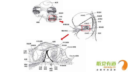 <span style="font-size:16px;"> 內耳或稱迷路,分為三個部分:半規管、前庭和耳蝸,負責聽覺的是耳蝸部分,外有骨殼,名骨迷路。耳蝸,顧名思義,像蝸牛殼一樣,耳蝸旋繞2.5~2.75圈。骨迷路的內壁被骨性螺旋板分成三部分,這三部分組成了三個錐形管腔(階),外面兩層含有淋巴液,頂部是前庭階,底部是鼓階,中間較小的三角形管腔是中階,又叫膜迷路,其中含有聽神經末梢分支。</span></p><p><span style="font-size:16px;"> </span></p><center><span style="font-size:16px;"><img alt="" src="/upfiles/20181116011946651.png" width="440" height="250" /></span></center><p></p><p><span style="font-size:16px;"> 骨迷路(右)</span></p><p><span style="font-size:16px;"> 鐙骨底板在卵圓窗里活動,振動了前庭階的外淋巴液。前庭階和鼓階在蝸孔相匯合,鼓階的另一端是圓窗,正好在卵圓窗和鐙骨底板的下方。中階被薄膜包裹,處于前庭階和鼓階之間,并與它們完全隔離。鐙骨底板在聲波的作用下,推動卵圓窗,使耳蝸內的淋巴液產生波動。顳骨很硬,淋巴液的壓力不能使之產生任何活動,因此,當鐙骨底板向里推動淋巴液時,淋巴液應有一個去處,圓窗部位就是淋巴液流動的方向。中階和前庭階有極薄的膜相隔離,而基底膜分隔中階和鼓階,基底膜是中階里螺旋器的根據地。中階的外壁由螺旋韌帶和微血管叢組成。血管叢可分泌內淋巴液,是內淋巴液化學成分的主要來源,內淋巴液是維持毛細胞功能的必要物質。基底膜上有支柱細胞、內毛細胞、外毛細胞和膠狀蓋膜等形成的螺旋器,又名Corti’s器。</span></p><p><span style="font-size:16px;"> </span></p><center><span style="font-size:16px;"><img alt="" src="/upfiles/201811160119529073.png" width="440" height="250" /></span></center><p></p><p><span style="font-size:16px;"> 耳蝸截面圖</span></p><p><span style="font-size:16px;"> 毛細胞是聽覺細胞,3500個內毛細胞和12000個外毛細胞很有序的排列著。普遍認為是外毛細胞比內毛細胞敏感35dB,因此更容易被大聲和耳毒藥物損害。蓋膜是一種膠狀物質,內側附在支持細胞上,其余部分覆蓋著毛細胞。毛細胞上的纖毛叢就埋在蓋膜里。淋巴液的波動或蓋膜的運動,可影響到毛細胞。淋巴液的波動使蓋膜產生猶如鋼琴鍵般的“剪切運動”,刺激毛細胞底部的神經末梢,產生神經沖動。耳蝸底部,離卵圓窗最近處,對高頻發生響應,耳蝸頂部,即遠離卵圓窗的地方,對低頻發生響應,中頻響應介于頂和底之間。</span></p><p><span style="font-size:16px;"> 更多詳情請登錄www.fujibankin.com</span></p>" />