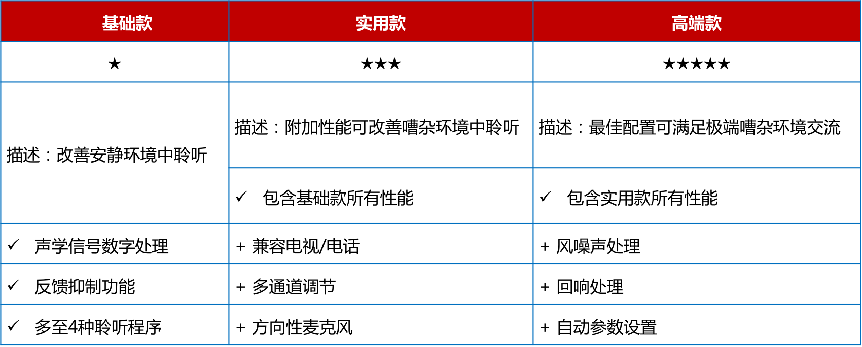 <span style="font-size:16px;"> 助聽(tīng)器價(jià)格取決于機(jī)器的檔次,而檔次由內(nèi)含的技術(shù)種類決定。助聽(tīng)器檔次大致可分為基礎(chǔ)款、實(shí)用款、高端款。這三種檔次的區(qū)別請(qǐng)參見(jiàn)下表:</span></p><p style="text-align: center;"><span style="font-size:16px;"><img src="/upfiles/201808150226553383.png" width="640" alt="" /><br /></span></p><p><span style="font-size:16px;"> 那么,如何應(yīng)該選擇哪種檔次的助聽(tīng)器呢?</span></p><p><span style="font-size:16px;"> 選擇助聽(tīng)器時(shí)主要需要考慮兩大因素。首先要考慮的就是弱聽(tīng)人士的聽(tīng)力損失程度,其次要考慮的就是弱聽(tīng)人士的日常生活方式。比方說(shuō),某位弱聽(tīng)人士是中度聽(tīng)力損失,日常在家為主,那么實(shí)用款檔次助聽(tīng)器通常可以滿足TA的需求。</span></p><p><span style="font-size:16px;"> 當(dāng)然,這里只是為助聽(tīng)器選配提供了大致方向,如何選配仍然需要具體情況具體分析,最好還是需要跟驗(yàn)配師面對(duì)面溝通。</span></p><p><span style="font-size:16px;"> 1、高端款助聽(tīng)器</span></p><p><span style="font-size:16px;"> 不同廠家的高端款助聽(tīng)器均代表了各自的尖端技術(shù),并致力于提供最佳的音質(zhì)。</span></p><p><span style="font-size:16px;"> 這類助聽(tīng)器高端之處在于自動(dòng)適應(yīng)各種聆聽(tīng)環(huán)境,最優(yōu)化佩戴者的聆聽(tīng)清晰度和舒適度,讓佩戴者在極度嘈雜的環(huán)境中,如咖啡館,也能清晰地聽(tīng)到同伴的言語(yǔ)聲。常見(jiàn)性能包括:</span></p><p><span style="font-size:16px;"> (1) 多種外觀、顏色可選;</span></p><p><span style="font-size:16px;"> (2) 環(huán)境自適應(yīng);</span></p><p><span style="font-size:16px;"> (3) 360°信號(hào)追蹤;</span></p><p><span style="font-size:16px;"> (4) 兼容各種藍(lán)牙設(shè)備。</span></p><p><span style="font-size:16px;"> 高端款助聽(tīng)器為什么能夠自動(dòng)適應(yīng)各種聆聽(tīng)環(huán)境呢?這是因?yàn)樽笥覂蓚?cè)的高端款助聽(tīng)器能夠相互“通電報(bào)”,精準(zhǔn)判斷所處的聆聽(tīng)環(huán)境并自主學(xué)習(xí),給出最佳的助聽(tīng)設(shè)置。</span></p><p><span style="font-size:16px;"> 比如,您經(jīng)常出入一家書(shū)店,每次您進(jìn)入這家書(shū)店時(shí)總是習(xí)慣性地將音量調(diào)低2分貝;長(zhǎng)此以往,當(dāng)您再次進(jìn)入該書(shū)店時(shí),兩臺(tái)助聽(tīng)器將會(huì)默契地降低2分貝。</span></p><p><span style="font-size:16px;"> 360°信號(hào)追蹤可以幫助佩戴者建立更佳的空間感知,對(duì)所處環(huán)境有充足的把控和預(yù)判,避免一些潛在的危險(xiǎn)。而當(dāng)助聽(tīng)器連接至各種藍(lán)牙設(shè)備時(shí),聆聽(tīng)清晰度會(huì)更高,且不會(huì)打擾其他人。</span></p><p><span style="font-size:16px;"> 比如家人總是抱怨您把電視機(jī)聲音開(kāi)得太大,拒絕跟您一起觀看電視時(shí),您可以選配能夠兼容電視的助聽(tīng)器,并進(jìn)行獨(dú)立的音量調(diào)節(jié),而家人只需設(shè)置為常規(guī)音量即可。高端款助聽(tīng)器的價(jià)位一般在15000以上。</span></p><p style="text-align: center;"><span style="font-size:16px;"><img src="/upfiles/201808150228328500.jpg" alt="" /><br /></span></p><p><span style="font-size:16px;"> 2、實(shí)用款助聽(tīng)器</span></p><p><span style="font-size:16px;"> 實(shí)用款助聽(tīng)器的價(jià)格一般在8000~15000之間。實(shí)用款助聽(tīng)器包含一定的降噪技術(shù)和言語(yǔ)提升功能,可以滿足大多數(shù)環(huán)境中的聆聽(tīng)需求。部分廠家的實(shí)用款助聽(tīng)器也可兼容各種藍(lán)牙設(shè)備。實(shí)用款助聽(tīng)器的突出性能大致包括:</span></p><p><span style="font-size:16px;"> (1) 可連接外接音源;</span></p><p><span style="font-size:16px;"> (2) 言語(yǔ)清晰度提升;</span></p><p><span style="font-size:16px;"> (3) 方向性功能。</span></p><p><span style="font-size:16px;"> 3、基礎(chǔ)款助聽(tīng)器</span></p><p><span style="font-size:16px;"> 基礎(chǔ)款助聽(tīng)器的價(jià)位一般在8000以下。基礎(chǔ)款助聽(tīng)器能夠滿足安靜環(huán)境中的交流需求,并具備反饋管理功能。反饋管理功能能夠有效提升佩戴舒適度,避免在日常佩戴過(guò)程中出現(xiàn)尖銳的干擾聲。</span></p><p><span style="font-size:16px;"> 基礎(chǔ)款助聽(tīng)器適用于經(jīng)常在家的弱聽(tīng)人士,若是生活方式比較豐富多彩的弱聽(tīng)人士建議選配其他檔次的助聽(tīng)器。實(shí)用款助聽(tīng)器的突出性能大致包括:</span></p><p><span style="font-size:16px;"> (1) 數(shù)字信號(hào)處理技術(shù);</span></p><p><span style="font-size:16px;"> (2) 反饋管理功能;</span></p><p><span style="font-size:16px;"> (3) 多種聆聽(tīng)程序可選。</span></p><p><span style="font-size:16px;"> 更多詳情請(qǐng)登錄www.fujibankin.com。</span></p>" />