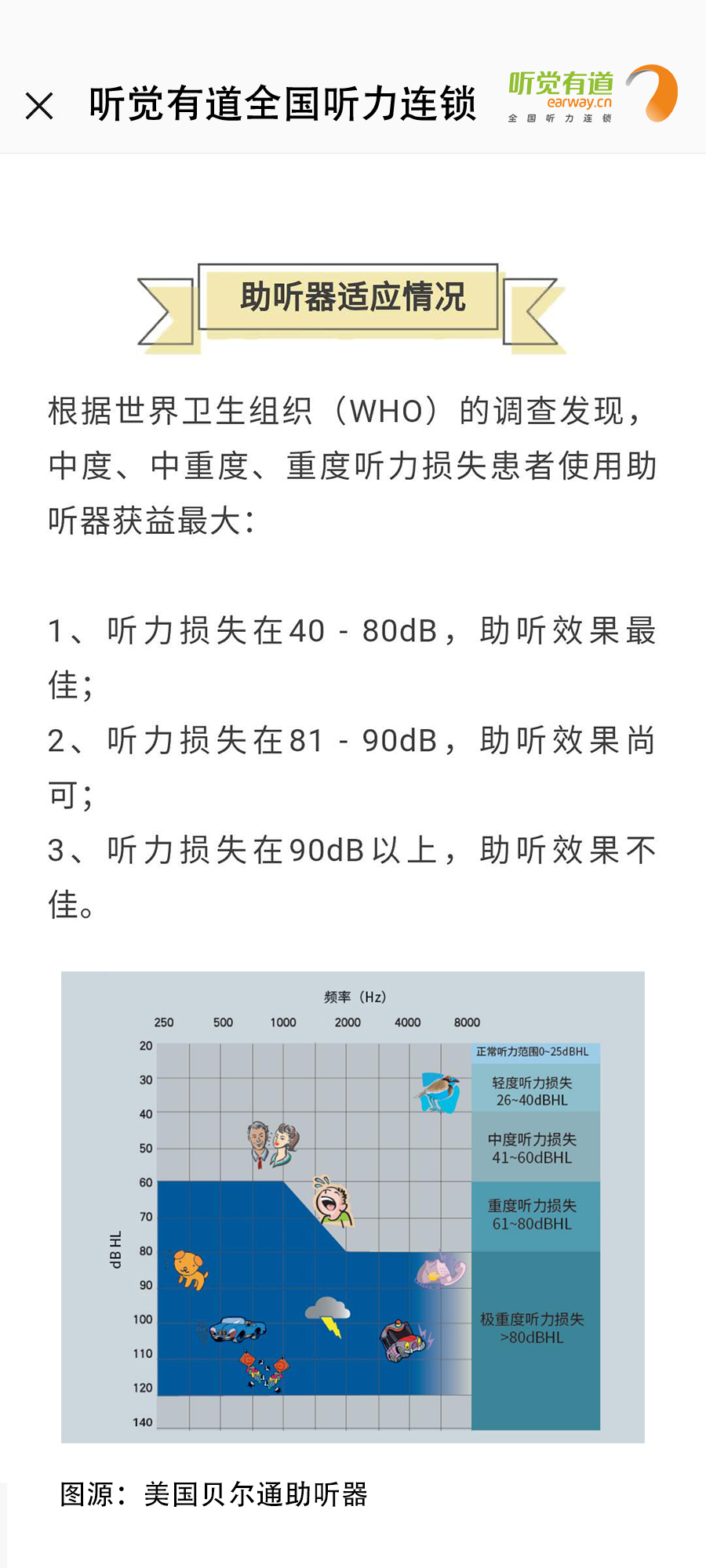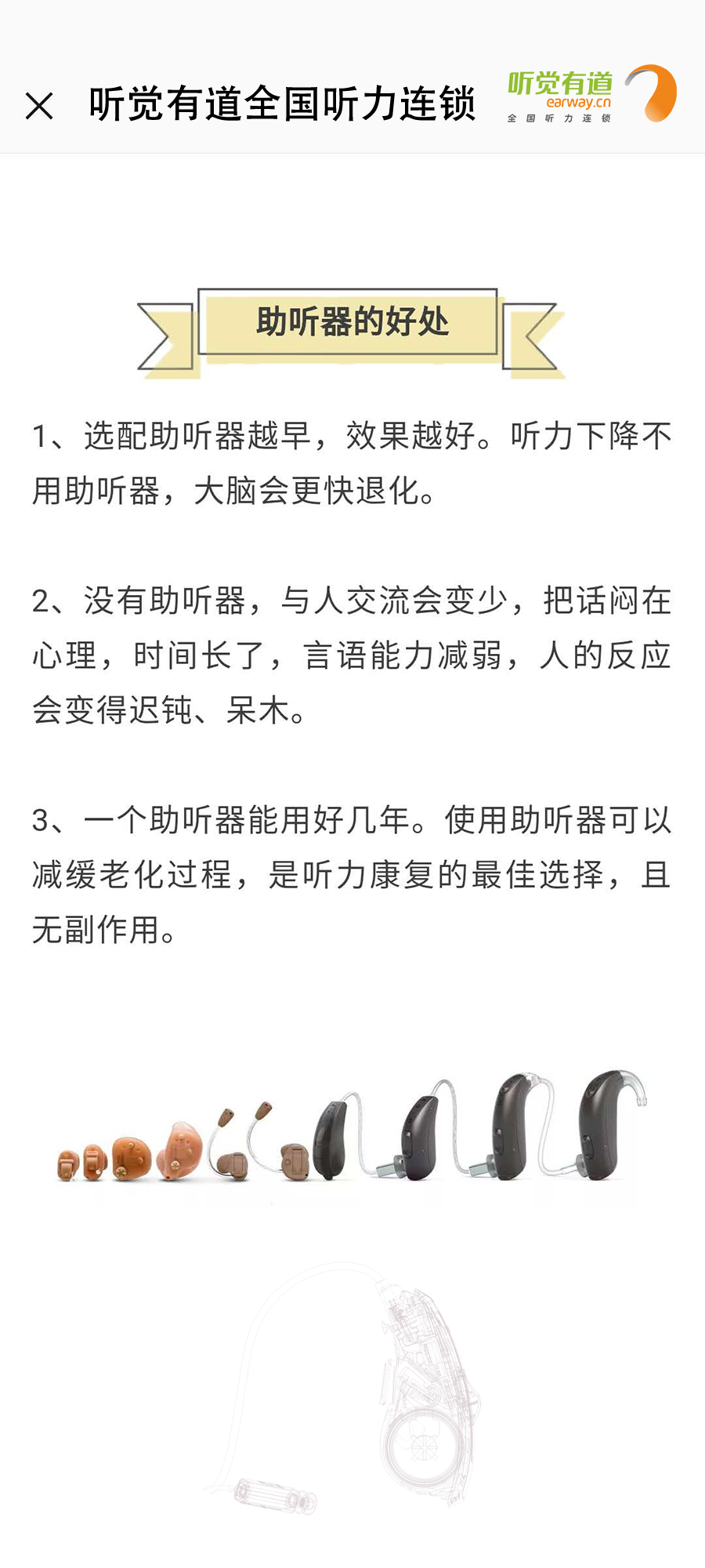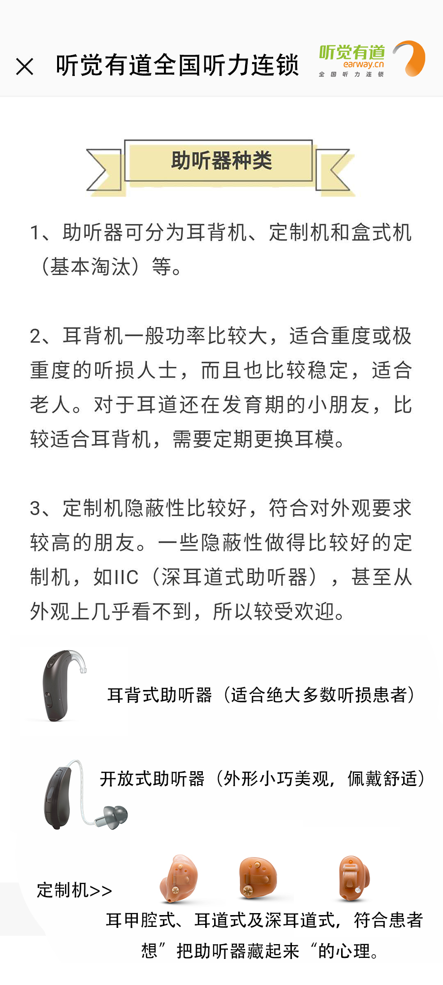 什么是助聽器?長什么樣子?有什么作用?如何使用?這里一一告訴您!</p><p> 助聽器是聽力障礙者使用的輔具,用來補足聽力損傷所造成的缺陷。廣義上講凡能有效地把聲音傳入耳朵的各種裝置都可以看作為助聽器,狹義上講助聽器是一個電聲放大器,通過它將聲音放大,使聽障者聽到了原來聽不清楚、聽不到的聲音。</p><p> 第一:助聽器的種類</p><p style="text-align: center;"><img src="/upfiles/201901180318143583.jpg" width="640" alt="" /><br /></p><p> 第二:助聽器的好處</p><p style="text-align: center;"><img src="/upfiles/201901180318334139.png" width="640" alt="" /><br /></p><p> 第三:如何適應助聽器</p><p style="text-align: center;"><img src="/upfiles/201901180318506440.jpg" width="640" alt="" /><br /></p><p> 第四:選配助聽器流程</p><p style="text-align: center;"><img src="/upfiles/201901180319039646.jpg" width="640" alt="" /><br /></p><p style="text-align: center;"><br /></p><p> 更多詳情請登錄www.fujibankin.com</p>" />