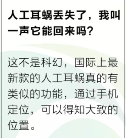 2019年4月10日這是一個(gè)新型的欄目<br /> 一本正經(jīng)地奇思妙想<br /> 內(nèi)容全靠一張圖<br /> 言語僅僅三兩句<br /> 大家隨便看看就行了<br /> 可一定得往心里去啊<br /><br /></span><div style="text-align: center;"><img src="/upfiles/20190410093258759.jpg" alt="" /></div> 嚴(yán)肅點(diǎn):幾乎每個(gè)月,都有人工耳蝸丟失的事件發(fā)生,每一次都會成為該地方新聞的焦點(diǎn)。<br /> 無論我們多么小心,不經(jīng)意間的疏忽總會造成大麻煩。對于遺失耳蝸的家庭來說,一方面要承擔(dān)一筆不少的購機(jī)費(fèi)用,另一方面會有一段時(shí)間的“聽力真空期”,我們不禁感嘆,要是耳蝸能自己報(bào)告位置就好了。<br /> 實(shí)際上這并非空想,國際某品牌人工耳蝸的最新設(shè)備已經(jīng)可以實(shí)現(xiàn)遺失位置定位,通過手機(jī),我們可以找到處理器所在的大致位置(如果你有興趣,可以留言交流)。<br /> 5G時(shí)代,萬物互聯(lián),遺失定位也是未來人工耳蝸產(chǎn)品設(shè)計(jì)的趨勢之一,未來小伙伴們就可以體驗(yàn)這種技術(shù)啦。<br /> 相關(guān)推薦閱讀:<a href="http://www.fujibankin.com/listDetail.aspx?id=102609" target="_blank"><strong><span style="color:#3333ff;">保如果世界上沒有聽力設(shè)備:助聽器和耳蝸。</span></strong></a><br /><br /><br /> 聽覺有道助聽器價(jià)格:http://www.fujibankin.com/products.html<br /><br /><br /> 發(fā)布于2019年4月10日 星期三<br /> 上午9:33分" />