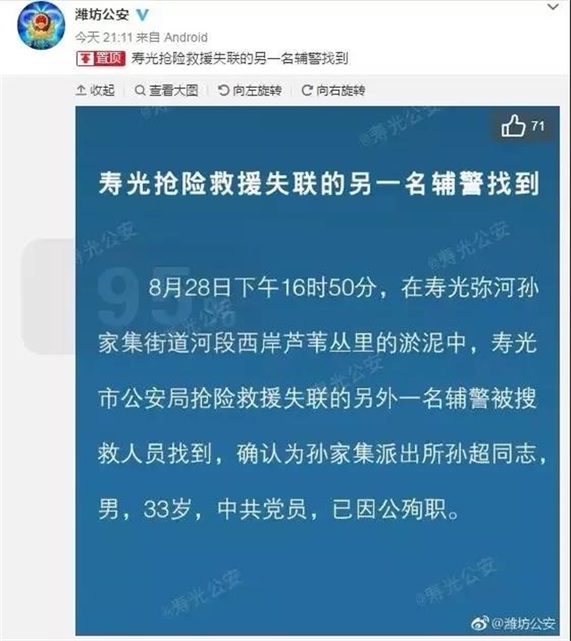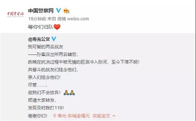 <span style="font-size: 16px;"> 2018年8月20日凌晨,壽光市兩名輔警在搶險(xiǎn)救援時,被洪水沖走失聯(lián)。事發(fā)后,經(jīng)過連續(xù)幾天的緊張搜救,他們以我們最不愿意看到的方式歸來了。</span></p><p><span style="font-size: 16px;"> 8月25日晚21時許,在彌河孫家集街道河段內(nèi)發(fā)現(xiàn)一人,確認(rèn)為孫家集派出所輔警魏澤坤同志(男,18周歲,因公殉職)。</span></p><p><span style="font-size: 16px;"> 8月28日下午16時,在彌河孫家集街道河段西岸發(fā)現(xiàn)另一名輔警,確認(rèn)為孫家集派出所孫超同志(男,33歲,因公殉職)。</span></p><p><span style="font-size: 16px;"> 他是家里的頂梁柱啊</span></p><p><span style="font-size: 16px;"> 33歲的孫超是家里的頂梁柱,他的愛人郭立華是聽覺有道的店長。</span></p><p><span style="font-size: 16px;"> 孫超有一子一女,大女兒才滿10歲,父母年近60,身體都不是很好。還有一個85歲的老奶奶,身體也不好,孫超失蹤時,一家人一直都不敢告訴她消息。</span></p><p><span style="font-size: 16px;"> 18日早,因?yàn)橄掠辏瑢O超怕路不好走,還提前送郭店長到門店上班,然后才回派出所。</span></p><p><span style="font-size: 16px;"> 事發(fā)前2小時,他們夫妻互通了電話。孫超說,自己全身濕透了,水很大,11點(diǎn)之后,就沒有了音訊。</span></p><p><span style="font-size: 16px;"> 他們夫妻倆都是好員工,孫超還是共產(chǎn)黨員,他們沒有好好地拍過幾張全家福,甚至沒能抽空一家人好好玩一天。</span></p><p><span style="font-size: 16px;"> 孫超是個好老公,他一回家就看孩子,哄孩子睡覺,一有空就給老婆孩子洗衣服。為了省錢養(yǎng)家,他連幾十塊錢的鞋子都舍不得買,老婆給他買回來了,他還不舍得穿……</span></p><p><span style="font-size: 16px;"> 對于我們而言,郭店長和孫超都像家人一樣,我們多么期盼他是平平安安地回來。</span></p><p><span style="font-size: 16px;"> 化作春泥更護(hù)花</span></p><p><span style="font-size: 16px;"> 兩位輔警失蹤的幾天,我們看到了人們對英雄的珍惜。</span></p><p><span style="font-size: 16px;"> 濰坊市調(diào)集了1000多名警力、700多名沿河鎮(zhèn)街干部群眾、11支專業(yè)救援隊(duì)、18艘沖鋒舟、20架無人機(jī)、10頭搜救犬等,全線展開大范圍搜尋。</span></p><p><span style="font-size: 16px;"> 還有很多人民群眾,也自發(fā)參與了本次救援,總計(jì)6000多人,為了找到2個人,找了幾天幾夜,很多人都沒怎么好好睡覺。</span></p><p><span style="font-size: 16px;"> 他們最希望的,是把他們安全帶回來。反正無論如何,都要把他們找到。</span></p><p><center><img src="/upfiles/201808310437256664.jpg" alt="" /></center><center><br /></center><center> <img src="/upfiles/20180831043725120.jpg" alt="" /> </center><center><br /></center><center><img src="/upfiles/20180831043725884.jpg" alt="" /> </center><center><br /></center><center><img src="/upfiles/201808310437253890.jpg" alt="" /></center><center><br /></center><center> <img src="/upfiles/201808310437262486.jpg" alt="" /> </center><center><br /></center><center><img src="/upfiles/20180831043726269.jpg" alt="" /></center><center><br /></center><center> <img src="/upfiles/201808310437264172.jpg" alt="" /> </center><center><br /></center><center><img src="/upfiles/201808310437261506.jpg" alt="" /></center><center><br /></center><center> <img src="/upfiles/201808310437267495.jpg" alt="" /></center><center><br /></center><center> <img src="/upfiles/201808310437262138.jpg" alt="" /><span style="font-size: 16px;"> </span><span style="font-size: 16px;"> </span></center></p><p></p><p><span style="font-size: 16px;"> 而很多人,在各個地方關(guān)注著這一切。</span></p><p><span style="font-size: 16px;"> 他們可能身處中國的各個角落,平時有各自的愛好,從事著不同的職業(yè),跟我們一樣,他們也都為兩位輔警擔(dān)憂過,祈禱過。</span></p><p><center><span style="font-size: 16px;"> <img src="/upfiles/201808310438352320.jpg" alt="" /> </span></center><center><span style="font-size: 16px;"><br /></span></center><center><span style="font-size: 16px;"><img src="/upfiles/201808310438359206.jpg" alt="" /></span></center><center><span style="font-size: 16px;"><br /></span></center><center><span style="font-size: 16px;"> <img src="/upfiles/201808310438359231.jpg" alt="" /></span></center></p><p></p><p><span style="font-size: 16px;"> 令人惋惜和哀痛的是,我們沒能等到想要的結(jié)局。但我們深知,兩位輔警并沒有徹底消失,在這片他們生活過的土地上,每一個角落都存在著他們的身影。</span></p><p><span style="font-size: 16px;"> 愿英雄安息</span></p><p><span style="font-size: 16px;"> 唯物者不信鬼神的存在,但兩位輔警的精神定與日月同輝;風(fēng)雨飄搖盡顯英雄本色,被風(fēng)雨洗禮的人們會記住孫超、魏澤坤這兩個名字,因?yàn)樗麄兩淖詈笠豢蹋冀K代表著人民的名義。</span></p><p><span style="font-size: 16px;"> 兩位英雄,他們?yōu)榱藫岆U(xiǎn)救援,離開了人世。</span></p><p><span style="font-size: 16px;"> 他們把最美好的青春歲月獻(xiàn)給了警營,留給了老百姓,卻還沒來得及跟自己的家人說一聲再見,多么令人哀痛和讓人崇敬!</span></p><p style="text-align: center;"><span style="font-size: 16px;"><img src="/upfiles/201808310439091398.jpg" alt="" /></span></p><p style="text-align: center;"><span style="font-size: 16px;"><br /></span></p><p style="text-align: center;"><span style="font-size: 16px;"> <img src="/upfiles/201808310439095302.jpg" alt="" /></span></p><p style="text-align: center;"><span style="font-size: 16px;"><br /></span></p><p style="text-align: center;"><span style="f