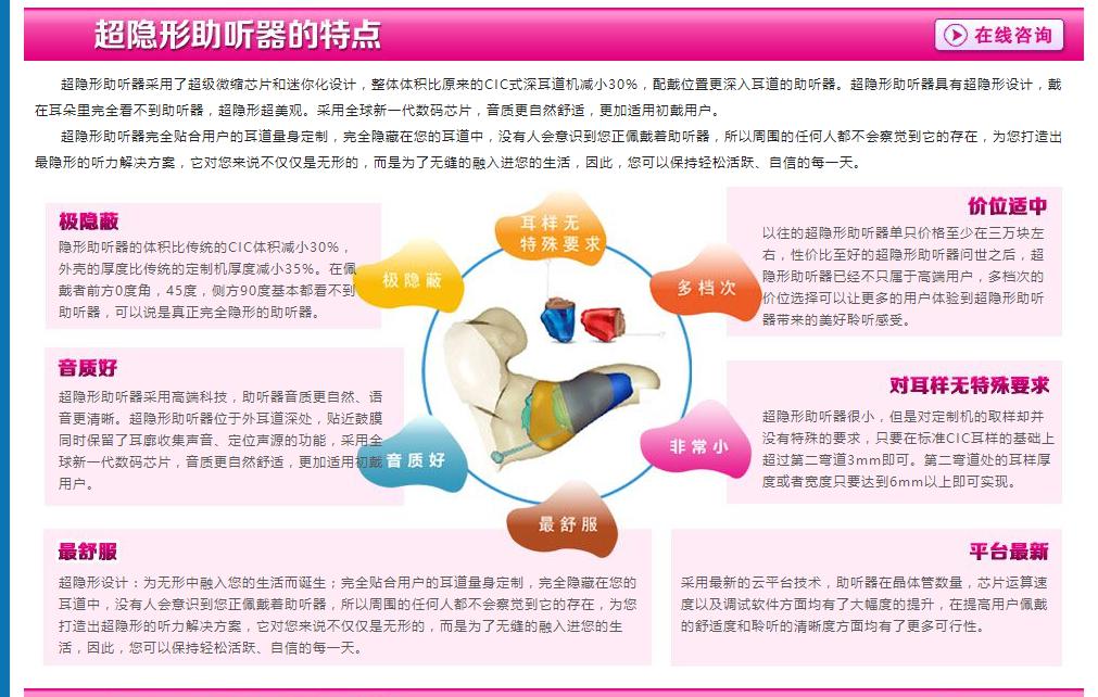 <span style="font-size:16px;"> 真正意義上的隱形助聽器應(yīng)該是invisible in canal,也就是IIC。IIC采用了更先進(jìn)的芯片和設(shè)計(jì),體積比原來的深耳道式助聽器(CIC)還要小20%以上,放置位置是在耳道的深處。</span></p><p><span style="font-size:16px;"> 需要注意,隱形助聽器戴在耳朵,在外面看是完全看不到助聽器的,不會(huì)被人發(fā)現(xiàn)有在佩戴助聽器,而且音質(zhì)、安全性、便攜性等各方面也做得非常好,特別適合對(duì)外形和性能上有高要求的用戶。</span></p><p><span style="font-size:16px;"> 隱形助聽器的選配須知</span></p><p><span style="font-size:16px;"> 1、隱蔽性極高</span></p><p><span style="font-size:16px;"> 目前最小的助聽器機(jī)型,無論從體積還是外殼厚度上,都比其他助聽器要小很多,從外面觀察基本完全看不到機(jī)身,做到真正意義上的“隱形”。</span></p><p><span style="font-size:16px;"> 2、舒適清晰</span></p><p><span style="font-size:16px;"> 位于外耳道深處,更接近耳膜,保留了耳廓收集聲音、聲源定位的功能,采用新一代的高科技芯片,晶體管數(shù)量、芯片運(yùn)轉(zhuǎn)速度都性能極好,音質(zhì)舒適自然,聽起來更清晰。</span></p><p><span style="font-size:16px;"> 3、高端機(jī)型</span></p><p><span style="font-size:16px;"> 外形和性能近乎完美結(jié)合,“隱形”的特性極為迷人。隱形助聽器屬于高端機(jī)型,一般價(jià)格都不會(huì)低,至少上萬元,不過其帶來的美好聆聽感受是無與倫比的。</span></p><p><span style="font-size:16px;"> 4、對(duì)耳樣無特殊要求</span></p><p><span style="font-size:16px;"> 對(duì)定制機(jī)的取樣無特殊要求,只要在標(biāo)準(zhǔn)CIC耳樣的基礎(chǔ)上超過第二彎道3mm即可。第二彎道處的耳樣厚度或?qū)挾戎灰_(dá)到6mm以上即可。</span></p><p><span style="font-size:16px;"> </span></p><center><img src="/upfiles/201712130407572536.jpg" alt="" /><br /></center>" />